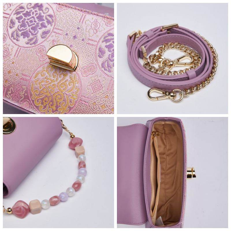 ブロケード マルベリーシルク チェーンバッグ パープル フローラル ハンドバッグ
