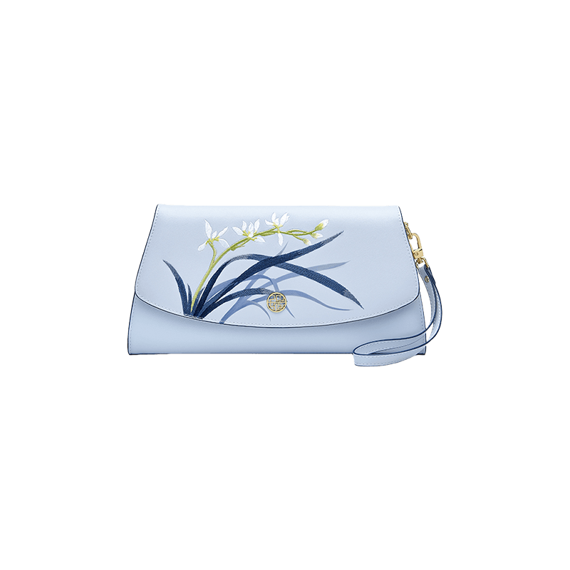 エンブロイダリーレザークラッチバッグ ブルーオーキッド エレガントハンドバッグ