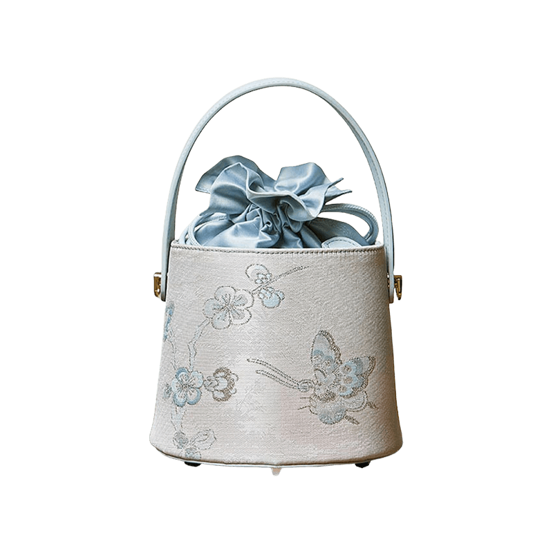 Brocade Jacquard Leather Drawstring Blue Butterfly Bucket Bag