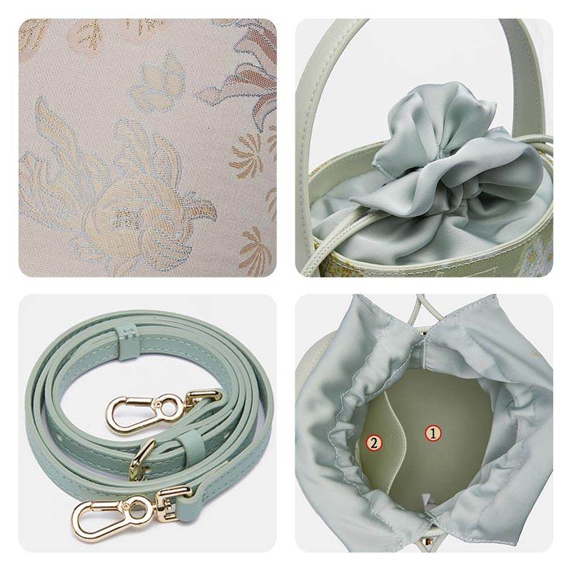 Brocade Jacquard Leather Drawstring Floral Powder Pink Bucket Bag
