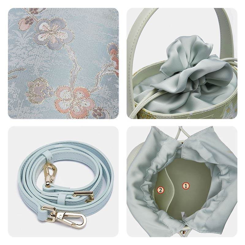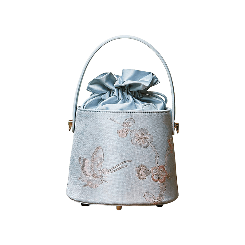 Brocade Jacquard Leather Drawstring Light Blue Butterfly Bucket Bag