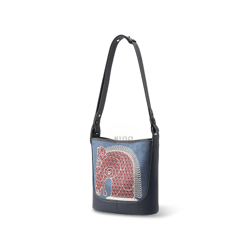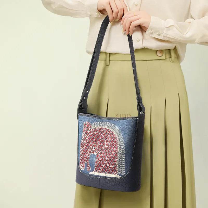 Chinoiserie Horse Pattern Embroidered Leather Crossbody Bag