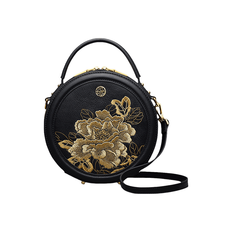 Embroidery Leather Round Handbag High Luxury Royal Gold Peony
