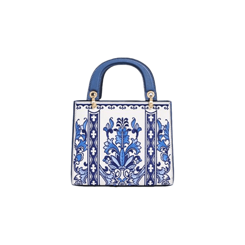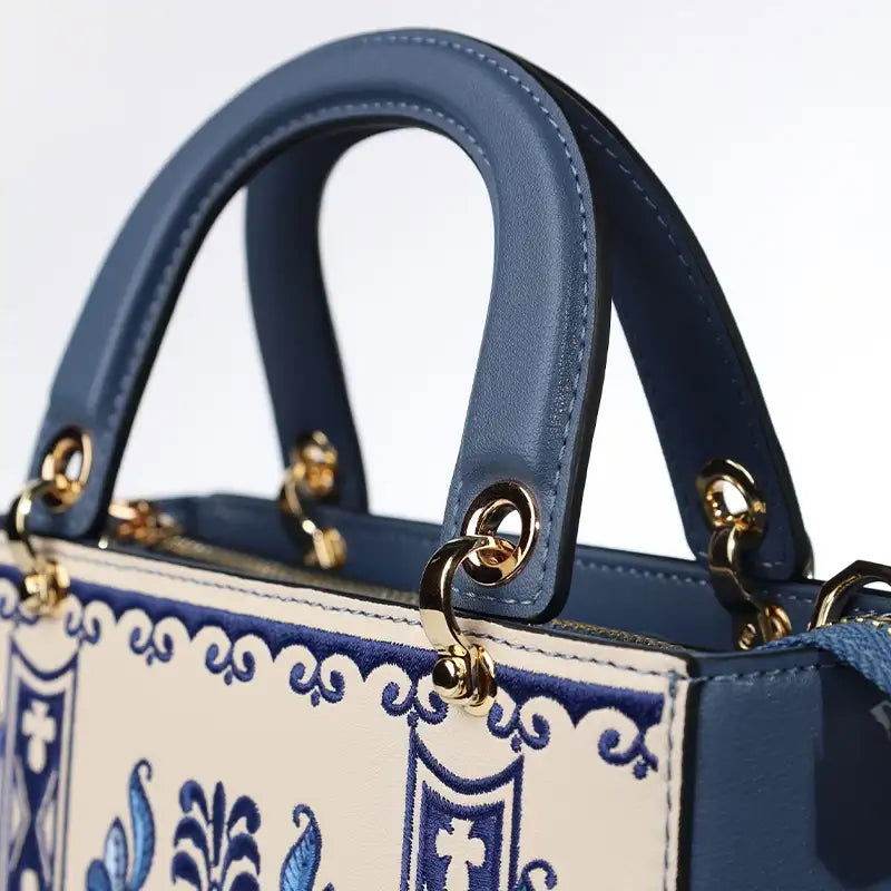 Handcrafted Embroidery Leather Handbag Blue and White Porcelain